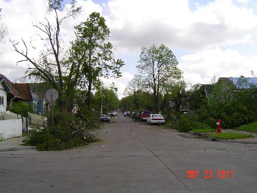 | This photo was taken from 39th and Bryant - looking south toward 38th and Bryant. Many houses had a tree down in the yard or on the roof. | |