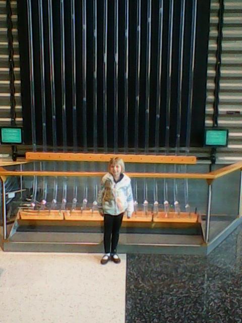 | Wednesday, April. Grandpa Dale, Grandma Bonnie, and Amanda all went to the Science Museum of Minnesota. Here is Amanda in front of the "bubble" sculpture. | |
