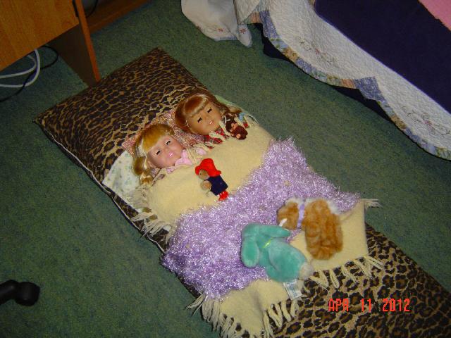 | Emily Jane and Abby Susan had a sleepover. Each one had a little pet and a big pet. | |