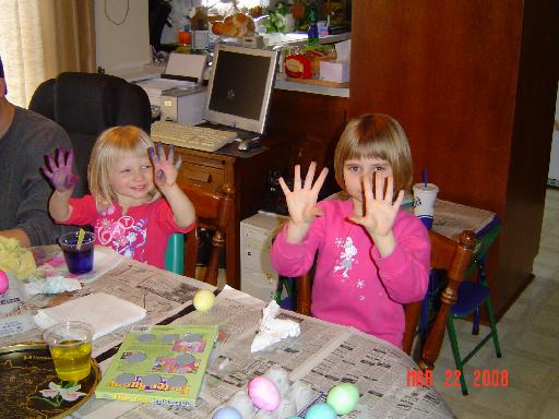Christie coloring her hands and Annabelle coloring eggs